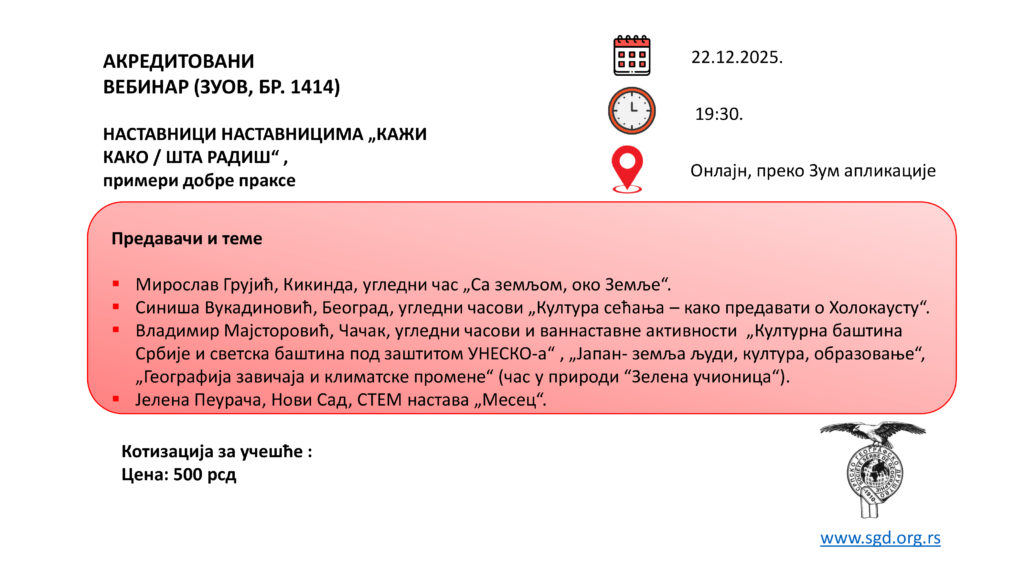 Српско географско друштво обавештава све своје чланове и јавност да је код Завода за унапређење образовања и васпитања акредитовало вебинар „НАСТАВНИЦИ НАСТАВНИЦИМА „КАЖИ КАКО / ШТА РАДИШ“ ,- примери добре праксе под каталошким бројем 1414.